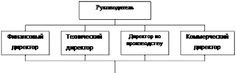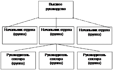 Рис. 1.5. Включение подсистемы управления персоналом в руководство организацией Данный вариант можно рассматривать как наиболее типичный для достаточно развитых организаций с выделением сферы управления персоналом в качестве равнозначной подсистемы управления организацией. Формирование внутренней оргструктуры системы управления персоналом включает следующие этапы: - структуризация целей системы управления персоналом; - определение состава функций управления, позволяющих реализовать цели системы; - формирование состава подсистемы оргструктуры; - установление связей между подсистемами оргструктуры; - определение прав и ответственности подсистем; - расчет трудоемкости функций и численности подсистем; - построение конфигурации оргструктуры. В зависимости от того, как спроектирована структура управления персоналом, как распределяются задачи и функции между подразделениями и отдельными работниками, а также, насколько обоснованно практикуется делегирование полномочий, у персонала складывается представление о степени доверия и демократизма в управлении организацией. Специалисты выделяют несколько типов организационных структур управления персоналом, каждая из которых отражает определенный подход. Чаще всего упоминаются: · Линейная. · Функциональная. · Матричная. Линейная оргструктура характеризуется следующими признаками: отношения строятся по принципу "руководство-подчинение"; возможность воздействия только на ограниченный круг подчиненных; информация курсирует между прямыми руководителями и подчиненными (рис. 1.6). Недостатки: высокая степень бюрократизации деятельности отдельных звеньев управления; длинная цепь организационного воздействия от руководителя до конечного исполнителя. Преимущества : простота организационных форм; четкость взаимосвязей. Такой подход к группированию работ и людей применяется обычно в организациях со строгим подчинением и субординацией (например, военные организации), а также как элемент общей системы управления организацией, когда выполняемые работы однотипны, а люди не дифференцируются по специальностям. В средних и больших организациях линейное деление дает эффект, как правило, на нижних уровнях иерархии (в отделах, группах, бригадах, звеньях). Как только работы начинают специализироваться, возникает необходимость перехода к другим типам оргструктур.