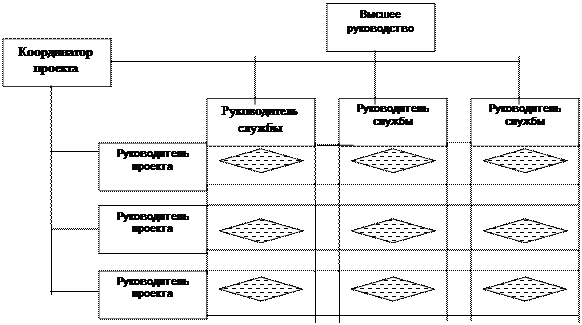 Рис. 1.7. Функциональная организационная структура управления персоналом Матричная оргструктура . Базовым структурным элементом такой системы становится не отдельная функция или вид деятельности, а многофункциональная команда, или группа, которая должна отвечать за удовлетворение всего набора запросов потребителей и требований рынка (рис. 1.8). Это "решетчатая" организация, построенная по принципу неординарного подчинения исполнителей. Управленческое воздействие осуществляется линейно, функционально и предметно. Недостатки: сложные организационные взаимоотношения; многопоточность информационных взаимосвязей; многоуровневое подчинение исполнителей; группы чаще всего не являются устойчивыми образованиями, а их интенсивное использование практически лишает членов группы своего постоянного рабочего места. Преимущества: повышение ответственности исполнителей; усиление контролирующих функций руководителей; быстрота реагирования на изменения внешней и внутренней среды организации.