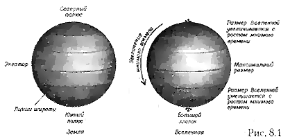 Если принять условие отсутствия границ, то оказывается, что вероятность развития Вселенной но большинству возможных историй пренебрежимо мала, но существует некоторое семейство историй, значительно более вероятных, чем остальные. Эти истории можно изобразить в виде как бы поверхности Земли, причем расстояние до Северного полюса соответствует мнимому времени, а размеры окружностей, все точки которых равно удалены от Северного полюса, отвечают пространственным размерам Вселенной. Вселенная начинается как точка на Северном полюсе. При движении на юг такие широтные окружности увеличиваются, что отвечает расширению Вселенной с течением мнимого времени (рис. 8.1). Вселенная достигает максимального размера на экваторе, а затем с течением мнимого времени сжимается в точку на Южном полюсе. Несмотря на то, что на Северном и Южном полюсе размер Вселенной равен нулю, эти точки будут сингулярными не более, чем Северный и Южный полюс на поверхности Земли. Законы науки будут выполняться в них так же, как они выполняются на Северном и Южном полюсах Земли. Но в действительном времени история Вселенной выглядит совершенно иначе. Десять или двадцать тысяч миллионов лет назад размер Вселенной имел минимальное значение, равное максимальному радиусу истории в мнимом времени. Затем, с течением действительного времени, Вселенная расширялась в соответствии с хаотической моделью раздувания, предложенной Линде (но теперь уже нет необходимости предполагать, что Вселенная была каким-то образом создана в правильном состоянии). Вселенная достигла очень больших размеров, а потом должна опять сжаться в нечто, имеющее в действительном времени вид сингулярности. Поэтому в каком-то смысле все мы обречены, даже если будем держаться подальше от черных дыр. Сингулярностей не будет лишь в том случае, если представлять себе развитие Вселенной в мнимом времени. Если Вселенная на самом деле находится в таком квантовом состоянии, то ее история в мнимом времени не будет иметь никаких сингулярностей. Но, как уже отмечалось, главное значение теорем о сингулярностях таково: они показывают, что гравитационное поле должно стать очень сильным, так что нельзя будет пренебречь квантовыми гравитационными эффектами. Именно это ведет к выводу, что в мнимом времени Вселенная должна быть конечной, но без границ и сингулярностей. По возвращении же в реальное время, в котором мы живем, обнаруживается, что сингулярности появляются опять. Астронавт, упавший в черную дыру, все равно придет к трагическому концу, и только в мнимом времени у него не было бы встречи с сингулярностями. Может быть, следовало бы заключить, что так называемое мнимое время - это на самом деле есть время реальное, а то, что мы называем реальным временем, - просто плод нашего воображения. В действительном времени у Вселенной есть начало и конец, отвечающие сингулярностях, которые образуют границу пространства-времени и в которых нарушаются законы науки. В мнимом же времени нет ни сингулярностей, ни границ. Так что, быть может, именно то, что мы называем мнимым временем, на самом деле более фундаментально, а то, что мы называем временем реальным, - это некое субъективное представление, возникшее у нас при попытках описать, какой мы видим Вселенную. Поэтому не имеет смысла спрашивать, что же реально - действите
