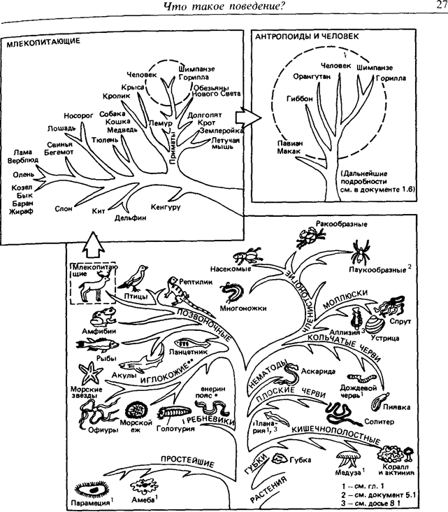 Рис. 1.15. Схема, предложенная Детье и Стелларом (Dethier, Stellar, 1961). Что такое поведение? 47 Документ 1.2. Миграция лососей - инстинктивное поведение или результат научения? Весной в быстрых и прозрачных водах какого-нибудь ручейка на севере Канады, в Скандинавии или в Шотландии появляется молодь лосося. Икра, отложенная прошлой осенью самками на гравии, покрывающем дно ручья, оплодотворяется самцами, и примерно через три месяца из нее вылупляются мальки. Спустя несколько лет (от двух до семи в зависимости от широты), проводимых в пресных водах, малек, превратившийся в молодого лосося-так называемую пестрятку-спускается вниз по реке, чтобы вскоре устремиться в океан. На этой стадии лосося называют серебрянкой, или смолт. Самцы и самки остаются в открытом море два или три года, удаляясь иногда от берегов почти на 3000 км. Лишь после достижения половой зрелости лососи начинают свое фантастическое путешествие на нерестилища. Рыбы проходят 50-100 км в день, чтобы прежде всего найти устье своей родной реки. Из десятков впадающих в море рек они направляются в ту, по которой спустились в море несколько лет назад, а затем без колебаний плывут по ней вверх до своего родного ручейка, где приступают к нересту. Хотя рыбы попадают в настоящий лабиринт притоков со многими разветвлениями, на каждой развилке между двумя направлениями они неизменно делают правильный выбор. И если они все же иногда ошибаются, то тут же поворачивают назад, возвращаясь на то место, где произошла ошибка; затем они вновь пускаются в путь, преодолевая самые быстрые течения и водопады, высота которых достигает подчас нескольких метров, чтобы после многодневных изнурительных усилий добраться до своих нерестилищ, до «земли предков», где они родились и где большая их часть погибнет, осуществив репродуктивную функцию. Эта проблема -одна из самых увлекательных. Каким образом эти рыбы после долгих лет отсутствия, преодолев огромные расстояния, находят тот ручей, где они появились на свет? Почему именно этот ручей, а не другой, столь же гостеприимный? Ученые продолжают поиски ответов на эти вопросы. Кажется вероятным, что важную роль играет здесь обоняние лососей, а определяющими факторами у берегов служат химический состав, вкус и запах воды. Но чем руководствуются рыбы, находясь в открытом море, и какие механизмы инициируют миграцию? Документ 1.3. Охрана территории у колюшки Колюшка-маленькая пресноводная рыбка, которую один из создателей современной этологии, Тинберген (Tinbergen, 1953), выбрал объектом своих исследований. У этого вида сооружение гнезда, охрана территории, забота об икре и о молоди лежит на самце, который загоняет самку в гнездо, чтобы она отметала икру. 48 Глава 1