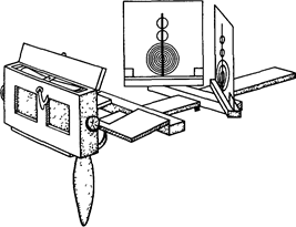 Рис. 7.5. Голубь в клетке Скиннера реагирует на световой сигнал, появляющийся перед ним на стенке при освещении пластмассового диска с другой стороны. В ответ на такой сигнал голубь ударяет по диску клювом, чтобы в кормушке появилось зерно. Допустим, что нам нужно обучить голубя ударять клювом по маленькому светящемуся кружку, когда он захочет получить вознаграждение в виде зернышка (рис. 7.5). Вначале мы будем давать ему зернышко каждый раз, когда он зайдет в ту половину клетки, где находится светящийся кружок. Далее мы будем вознаграждать его лишь в том случае, если он не только зашел в эту половину клетки, но еще и повернулся головой к стенке, на которой находится кружок. На третьем этапе можно, например, давать зернышко при сочетании этих двух условий, если вдобавок еще клюв животного направлен в сторону кружка. Затем постепенно можно заставить голубя касаться клювом кружка и, наконец, ударять по нему с целью получить вознаграждение. Как мы видим, при таком методе обучения к очередному этапу переходят лишь тогда, когда уже сформировалась поведенческая реакция, необходимая на предыдущем этапе (рис. 7.6). По мнению Скиннера и других бихевиористов, именно так происходит выработка большинства поведенческих реакций у человека. Действительно, можно привести множество примеров, как будто бы частично подтверждающих это. С позиций Скиннера можно объяснить очень быстрое обучение ребенка первым словам (не распространяя, однако, эту концепцию на освоение языка в целом). Вначале, когда ребенок еще только начинает произносить какие-то членораздельные звуки, лепет «ме-ме-ме» уже вызывает восторг окружающих, и особенно счастливой мамы, которой уже кажется, что дитя зовет именно ее. Однако вскоре энтузиазм родителей по поводу таких звуков остывает до тех пор, пока младенец ко всеобщей радости не выговорит «мо... мо». Потом и эти звуки перестают для новорожденного подкрепляться, пока не появится сравнительно членораздельное «мо-мо». В свою очередь это слово по тем же причинам вскоре сменится сочетанием «мома», и наконец ребенок отчетливо выговорит свое первое слово-«мама». Все же остальные звуки будут восприниматься окружающими лишь как «детский лепет» в буквальном смысле слова, и они постепенно исчезнут из «лексикона» новорожденного. 311