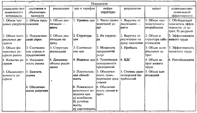 где R — реальная емкость рынка; Р — стоимость оказанных услуг; Е — экспорт услуг; I — импорт услуг. Этот расчет осуществляется в денежном выражении, причем экспорт и импорт услуг пересчитываются в рубли по курсу МВБ на момент оказания услуг. Система показателей рынка услуг, методика их исчисленияВ решении задач статистики рынка услуг важная роль отводится системе показателей. Сформулируем основные принципы ее построения: - система показателей (в отличие от произвольного набора, перечня показателей) предполагает, что все показатели взаимосвязаны и ориентированы на достижение цели исследования; - система показателей строится на единых методологических принципах, что является необходимой предпосылкой их сопоставимости; - система показателей должна быть компактной, что не исключает дополнения обобщающих показателей показателями подсистемы. Для характеристики рынка услуг целесообразно использовать систему показателей, приведенную в табл.2. Таблица 2 Система показателей рынка услуг