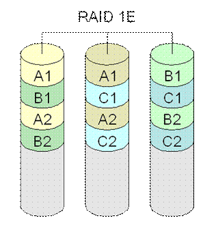 Комбинирует в себе RAID 0 и RAID 1. Создаётся минимум на трёх дисках. Данные пишутся с чередованием на три диска, а со сдвигом на 1 диск пишется их копия. Если пишется один блок на три диска, то копия первой части пишется на второй диск, второй части – на третий диск. При использовании четного числа дисков лучше, конечно, использовать RAID 10. RAID 5E