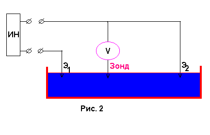 установка представляет собой прямоугольную ванну с электролитом, в которую погружены два электрода. Электроды присоединены к источнику постоянного низковольтного напряжения. Один из электродов через вольтметр связан с подвижным зондом (курсор). Вольтметр показывает напряжение между отрицательно заряженным электродом и точкой в ванне, в которую помещен зонд.