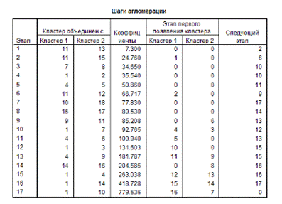 Рис. 9 Таблица «Шаги агломерации» 2) Провести классификацию областей иерархическим методом с алгоритмом межгрупповых связей и отобразить результаты в виде дендрограммы; Теперь, используя оптимальное количество кластеров, проводим классификацию областей иерархическим методом. И в выходных данных обращаемся к таблице «Принадлежность к кластерам». (Рис.10)