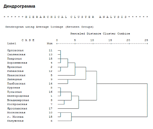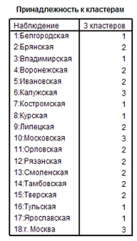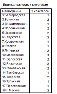 Рис. 10 Таблица «Принадлежность к кластерам» На Рис. 10 отчетливо видно, что в 3 кластер попали 2 области (Калужская, Московская) и г. Москва, во 2 кластер две (Брянская, Воронежская, Ивановская, Липецкая, Орловская, Рязанская, Смоленская, Тамбовская, Тверская), в 1 кластер – Белгородская, Владимирская, Костромская, Курская, Тульская, Ярославская.