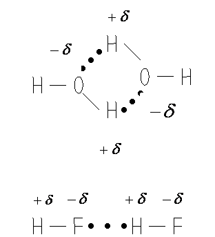 а + - + - б - + - + В каждый данный момент времени направление диполей может быть иным. Однако их согласованное возникновение обеспечивает слабые силы взаимодействия, приводящие к образованию жидких и твердых тел. В частности, оно обусловливает переход благородных газов при низких температурах в жидкое состояние. Таким образом, наименьшей составляющей среди сил, действующих между молекулами, является дисперсионное взаимодействие. Между молекулами с малой полярностью или не имеющими полярности (CH4 , H2 , HI) действующими силами являются в основном дисперсионные. Чем больше собственный дипольный момент молекул, тем больше ориентационные силы взаимодействия между ними. В ряду однотипных веществ дисперсионное взаимодействие возрастает с увеличением размеров атомов, составляющих молекулы этих веществ. Например, в HCl на долю дисперсионных сил приходится 81% всего межмолекулярного взаимодействия, для НВr эта величина составляет 95%, а для HI – 99,5%. 3. металлическая связь и ее свойства 4. водородная связь. Водородная связь является особым видом химической связи. Известно, что соединения водорода с сильно электроотрицательными неметаллами, такими как F, О, N, имеют аномально высокие температуры кипения. Если в ряду Н2Тe – H2Se – H2S температура кипения закономерно уменьшается, то при переходе от H2S к Н2О наблюдается резкий скачок к увеличению этой температуры. Такая же картина наблюдается и в ряду галогенводородных кислот. Это свидетельствует о наличии специфического взаимодействия между молекулами Н2О, молекулами HF. Такое взаимодействие должно затруднять отрыв молекул друг от друга, т.е. уменьшать их летучесть, а, следовательно, повышать температуру кипения соответствующих веществ. Вследствие большой разницы в ЭО химические связи H–F, H–O, H–N сильно поляризованы. Поэтому атом водорода имеет положительный эффективный заряд (δ+), а на атомах F, O и N находится избыток электронной плотности, и они заряжены отрицательно (d-). Вследствие кулоновского притяжения происходит взаимодействие положительно заряженного атома водорода одной молекулы с электроотрицательным атомом другой молекулы. Благодаря этому молекулы притягиваются друг к другу (жирными точками обозначены водородные связи).