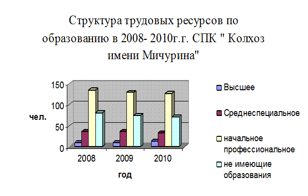 Рис.1 Организационная структура предприятия – является достижение организационных целей, где предлагается совместная работа людей, являющихся работниками предприятия. Организационная структура определяет соотношение между функциями, выполняемыми сотрудниками предприятия. Она проявляется в таких формах как разделение труда, создание специализированных подразделений, иерархия должностей, внутриорганизационные процедуры и является необходимым элементом эффективной организации. СПК « Колхоз имени Мичурина» относится к традиционному типу. Управление идет от председателя к его подчиненным - главным специалистам, от специалистов идет распределение управленческих задач по подразделениям, службам, далее до рабочих. В организационной структуре – присуща чёткая структура, разделение труда, баланс полномочий и ответственности, взаимодействие группы людей с определённой техникой. Анализ организационной структуры - тесно связан с целями, функциями, процессом управления, работой специалистов и распределением между ними полномочий во исполнение определённых целей. Система организационной структуры управления организации построена для того, чтобы все протекающие в ней процессы осуществлялись своевременно и качественно. Отсюда то внимание, которое уделяют ей руководители организаций и специалисты, с целью непрерывного совершенствования, развития как системы в целом, так и её отдельных составляющих. Недостатки традиционной структуры – отсутствие взаимосвязей и взаимодействия между подразделениями, недостаточно четкая ответственность. 1.4 . Характеристика персонала кооператива Персонал предприятия - это совокупность физических лиц, состоящих с предприятием как с юридическим лицом в отношениях, регулируемых договором найма. Он представляет собой коллектив работников с определенной структурой, соответствующей научно-техническому уровню производства, условиям обеспечения производства рабочей силой и установленным нормативно-правовым требованиям. Персонал предприятия характеризует трудовые и человеческие ресурсы производства. Он отражает совокупность работников различных профессионально-квалификационных групп, занятых на предприятии и входящих в его списочный состав. Количественные характеристики персонала предприятия в первую очередь измеряются такими показателями, как списочная, явочная и среднесписочная численность работников. Качественная характеристика персонала предприятия определяется степенью профессиональной и квалификационной пригодности ее работников для достижения целей предприятия и производства работ. Среднесписочная численность работников предприятия и его внутренних подразделений за определенный период;- удельный вес работников отдельных подразделений (групп, категорий) в общей численности работников предприятия; -темпы роста (прироста) численности работников предприятия за определенный период; - удельный вес служащих, имеющих высшее или среднее специальное образование в общей численности служащих и (или) работников предприятия; - средний стаж работы по специальности руководителей и специалистов предприятия и остальных работников предприятия; - текучесть кадров; - Фондовооруженность труда работников. Совокупность перечисленных и ряда других показателей может дать пр