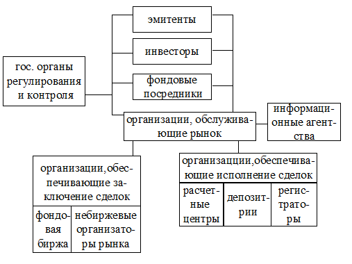 Основным инвестором, определяющим состояние фондового рынка, является индивидуальный инвестор, т.е. физическое лицо, использующее свои сбережения для приобретения ценных бумаг. Основной круг инвесторов, вложивших свои средства в акции - это работники приватизированных предприятий, которые на начало 1996 г. являются самой мощной группой собственников российских акционерных обществ, на долю которых приходится 42-43% акций этих предприятий. Юридические лица, не имеющие лицензии на право осуществления профессиональной деятельности на рынке ценных бумаг в качестве посредников, но приобретающие ценные бумаги от своего имени и за свой счет, составляют институционных инвесторов. В эту группу входят государство; корпоративные инвесторы, к которым относятся предприятия и организации, располагающие денежными средствами, но не имеющие осуществлять собственные инвестиции. Кроме того, существуют инвестиционные компании. Осуществляя деятельность на рынке ценных бумаг, они получают доход, доля которого не может быть ниже 50% от совокупного. В противном случае последует отзыв лицензии. Крупнейшим внутренним инвестором в России способно стать население. По данным Госкомитета РФ по статистике, денежные накопления российского населения превышают 250 млрд. руб. (с учетом деноминации). Из них остатки средств на вкладах составляют около 55% всех накоплений. Иностранные инвесторы также сохраняют интерес к России-например, немецкий концерн «Рургаз» купил пакет акций Газпрома. На рынке субфедеральных займов основными инвесторами являются Сбербанк, МФК, Инкомбанк, банк «Российский кредит». Несомненно, инвесторами выступают и профессионалы фондового рынка, осуществляющие весь комплекс операций на нем, но лишь в том случае, если они вкладывают собственные средства в ценные бумаги. Основной задачей профессиональных участников рынка ценных бумаг является выполнение функций по сведению продавца и покупателя инвестиционных ресурсов и организация взаимодействия между ними. Профессиональные участники рынка ценных бумаг. Профессиональные участники рынка ценных бумаг-юридические лица, в том числе кредитные организации, а также физические лица, зарегистрированные в качестве предпринимателей, которые осуществляют виды деятельности, указанные в главе 2 Закона о рынке ценных бумаг. В этой главе описаны следующие виды профессиональной деятельности на рынке ценных бумаг: 1.Брокерская деятельность. 2.Дилерская деятельность. 3.Деятельность по управлению ценными бумагами. 4.Деятельность по определению взаимных обязательств (клиринг). 5.Депозитарная деятельность. 6.Деятельность по ведению реестра владельцев ценных бумаг. 7.Деятельность по организации торговли на рынке ценных бумаг. -Брокерской деятельностью является совершение гражданско-правовых сделок с ценными бумагами в качестве поверенного или комиссионера, действующего на основе договора-поручения или комиссии либо доверенности на совершение таких сделок. -Дилерской деятельностью является совершение сделок купли-продажи ценных бумаг от своего имени и за свой счет путем публичного объявления цен покупки и (или) продажи определенных ценных бумаг с обязательством покупки и (или) продажи этих ценных бумаг по объявленным ценам. Отличие дилера и брокера заключается в том, что дилер занимается к