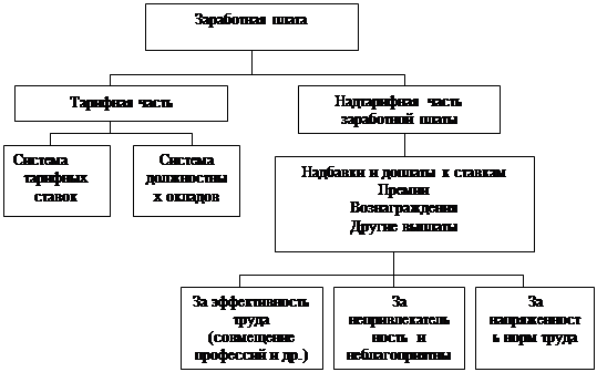 Рис. 1. Структура заработной платы Количественное соотношение тарифной и надтарифной частями заработка существенно влияет на стимулирующие возможности системы материальной заинтересованности в целом, т. к. увеличение или уменьшение одной из них – не простое перераспределение каналов, по которым доводиться оплата труда до работника, а изменение характера связи с результатами труда. Тарифная заработная плата связана с ними не прямо, а опосредованно, через принадлежность работника к конкретной профессионально-квалификационной группе, начисляется за результаты, которые должны быть получены, если его работа отвечает квалификационным требованиям, соответствующего для занимаемого им рабочего места. Надтарифной частью результаты оцениваются непосредственно по определенным качественным и количественным показателям индивидуальной и коллективной деятельности. Формы и системы оплаты труда позволяют применить к каждой группе и категории работников определенный механизм начисления заработной платы путем установления функциональной зависимости между мерой труда и его оплатой, а также более точно учесть количество и качество труда, вложенного в производство продукции и конечные результаты деятельности организации. Статьей 63 Трудового кодекса Республики Беларусь определено, что формы, системы и размеры оплаты труда работников, в том числе дополнительные выплаты стимулирующего и компенсирующего характера, устанавливаются нанимателем на основании коллективного договора, соглашения и трудового договора, исходя из организационно-технических условий производства и задач по выпуску продукции, вида производства, особенностей его технологии и организации, обеспеченности рабочей силой, качества применяемых норм и других факторов, способствующих повышению качества продукции, экономии материальных ресурсов и т.д. Частью четвертой названной статьи предусмотрено, что дифференциация размера оплаты труда в зависимости от сложности и напряженности труда, его условий, уровня квалификации работников. При этом установлено, что заработная плата работников предельными размерами не ограничивается. При выборе форм оплаты труда необходимо исходить из того, что они должны выполнять определенные функции: 1. Обеспечивать материальную заинтересованность работников в повышении производительности труда. 2. Соответствовать организационно-техническим условиям, особенностям технологического процесса характеру применяемых средств труда и формам его организации. 3. Быть экономически обоснованными, т.е. экономический эффект, получаемый от их применения, должен превышать размер выплачиваемого вознаграждения. Формы и системы оплаты труда должны также обеспечивать равную плату за равный труд и усиливать ее зависимость от результатов деятельности как отдельного работника, так и от эффективности хозяйствования организации в целом. В настоящее время на предприятиях республики применяются две формы оплаты труда: сдельная и повременная. Применяются также и их многочисленные системы, основанные на применении Единой тарифной сетки работников РБ, которая представляет собой шкалу совокупности квалификационных (тарифных) разрядов, каждому из которых присвоен свой тарифный коэффициент, показывающий, во сколько раз тарифные ставки вто