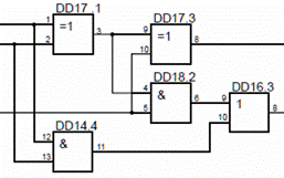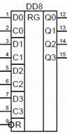 Рисунок 3.4 – Условное графическое обозначение регистра Всего в схеме электрической принципиальной умножителя используется четыре регистра DD8, DD9, DD26, DD27. В DD8 в первые три разряда записывается пришедшее с клавиатуры число (множимое). В четвертый разряд записывается 1 – флаг того, что число уже пришло и его можно вывести на индикатор. То же для DD9, только записывается уже второе число (множитель). В DD27 записываются 3 младших разряда результата и флаг нажатия кнопки умножить. В DD28 записываются три старших разряда и флаг нажатия кнопки равно. 3.4 Блок умножения С DD8 и DD9 информация (множимое и множитель) поступают на вход умножителя реализованного комбинационным методом (рисунок 1.1). Схема сумматора который входит в состав умножителя изображена на рисунке 3.5. Умножитель ничем не тактируется, и не зависит ни от каких управляющих сигналов, а поэтому умножает всегда. Т.е. как только будет введено второе число (множимое), на выходе умножителя сформируется результат. А по нажатию кнопки равно он запишется в регистры DD26, DD27.