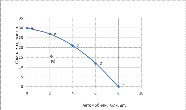 а) изобразите графически кривую производственных возможностей; б) объясните, что показывают точки ниже и выше этой кривой.