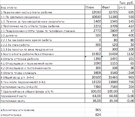 Для определения резерва выпуска продукции необходимо возможный прирост среднечасовой выработки умножить на планируемый фонд рабочего времени всех рабочих. 5 Анализ фонда заработной платы. Анализ использования трудовых ресурсов, уровня производительности труда необходимо рассматривать в тесной связи с оплатой труда. С ростом производительности труда создаются предпосылки для повышения уровня его оплаты. При этом средства на оплату труда нужно использовать таким образом чтобы темпы роста производительности труда опережали темпы роста его оплаты. Преступая к анализу использования ФЗП в первую очередь необходимо рассчитать абсолютное и относительное отклонение фактической его величины от плановой (базисной). Абсолютное отклонение Относительное ФЗП рассчитывается как разность между фактической суммой з/п и плановым фондом скорректированным на коэффициент выполнения плана по производству продукции. Однако необходимо учитывать что корректируется только переменная часть ФЗП(расплата рабочих по сдельным расценкам, премии за производственные результаты, сумма отпускных соответствующей доле переменным зарплатам) Исходные данные для анализа ФЗП.