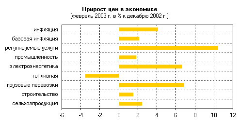 | Анализ Инфляция за первый квартал 2003 г. составила 5,2% (в январе-марте 2002 г. – 5,4%), напомним, что по правительственным планам 10-12% годовых. Пока, получается все 20%. Структура инфляции