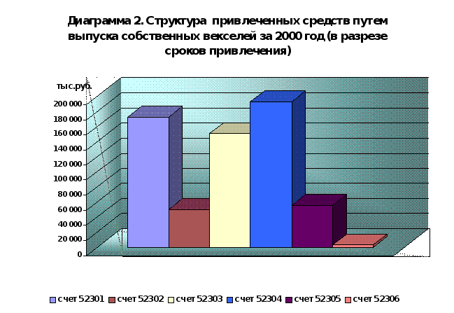 Как видно, основную долю в портфеле занимают векселя с долгосрочным характером привлечения средств (до 1 года) – 93% от общего остатка, а векселя сроком до востребования и имеющие большую вероятность быть предъявленными к погашению – 7 %. Согласно аналитической таблице, принятой за основу при проведении анализа, все векселя являются бездисконтными и безпроцентными и выпущены по цене 100% от номинала. Анализируя деятельность банка в рассматриваемом направлении за 2000 год, а также по данным, приведенным в рассматриваемой таблице, можно увидеть, что погашение векселей производится в большинстве случаев также по номиналу без применения дисконтов или процентных ставок. В данном случае можно предположить варианты: 1. первые векселедержатели имеют свободные денежные средства, которые желают разместить в векселя КБ «Собинбанк» и при этом его совсем не интересует доход, который он может на этом заработать (что не похоже на реальность); 2. перед нами разворачивается схема вексельного безпроцентного кредитования (что тоже не совсем похоже на правду, учитывая объемы); 3. покупатели векселей являются постоянными «клиентами» и участниками какой – либо схемы расчетов, или, проще говоря, «отмывают» деньги, обеспечивая банк при этом ресурсами на некоторый срок. Третий вариант выглядит более правдоподобно, попытаемся доказать это предположение исходя из имеющихся данных. Говоря об объемах, проанализируем данные за 2000 год и январь 2001 года. Так, например, за указанный период всего было привлечено путем выпуска собственных векселей средств на общую сумму 627114 тыс. руб. из них в разрезе сроков привлечения (см. Диаграмму 2.):