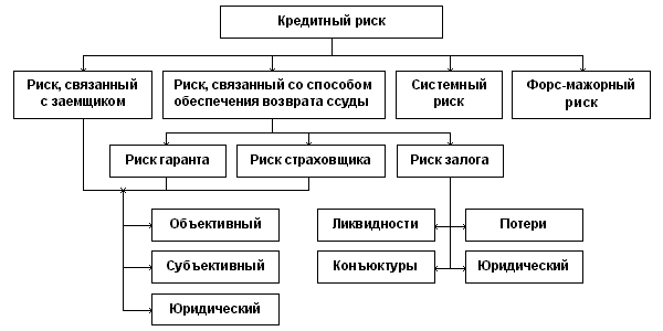 Перечисленные типы рисков взаимосвязаны. Очевидно, что кредитный риск ведет к возникновению всей цепочки банковских рисков, а также может привести к риску ликвидности и неплатежеспособности банка. Поэтому от организации кредитного процесса зависит «здоровье» банка. Процентный риск в своем роде самостоятелен, так как связан с конъюнктурой на рынке кредитных ресурсов, и действует как фактор, не зависящий от банка. Однако он в состоянии усугубить кредитный риск и всю цепочку рисков, если банк не будет приспосабливаться к изменению уровня рыночной процентной ставки. На рисунке 2 приведена одна из возможных структур кредитного риска [16]. Оговорка "одна из возможных" сделана в связи с тем, что с развитием общества источники кредитного риска могут изменяться. Рисунок 2