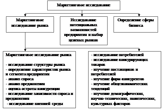 Рисунок 1 - Структура маркетингового исследования Маркетинговое исследования является составной частью общей информационной системы. Сведения, факты, данные, собираемые для маркетинговых целей, образуют самостоятельный сектор единого информационного поля. Поэтому маркетинговое исследование базируется на общих требованиях и принципах информатики и при его проведении необходимо соблюдать следующие принципы: - научность, т.е. объяснение и предсказание изучаемых рыночных явлений и процессов на основе научных положений и объективно полученных данных, а также выявление закономерностей развития этих явлений и процессов; - системность, т.е. выделение отдельных структурных элементов, составляющих явление, обнаружение иерархической связи и взаимоподчиненности; - комплексность, т.е. изучение явлений и процессов во всей их полноте, взаимосвязи и развитии; - достоверность, т.е. получение адекватных данных за счет обеспечения научных принципов их сбора и обработки, исключение тенденциозности в оценках, тщательный контроль, использование научных инструментов исследования; - объективность, т.е. требование учитывать возможные погрешности измерителя того или иного явления, не подгонять факты под заранее определенную схему и соблюдать осторожность в их интерпретации; - эффективность, т.е. достижение выдвинутых целей, соизмерение результатов с затратами. [4, с.23] В маркетинговом исследовании лучших результатов добивается тот, кто осуществляет творческий подход, проявляет инициативу, находит новые, нетрадиционные пути исследования. Крупное производственное или торговое предприятие может позволить себе иметь в составе маркетинговой службы подразделение, функцией которого будет организация и проведение маркетинговых исследований. Средние и тем более малые предприятия не располагают такими возможностями и либо ограничиваются небольшими подразделениями в несколько человек, либо прибегают к совмещению профессий, поручая одному из сотрудников, выполняющему какие-либо функции маркетинга, проведение исследовательской работы. [5, с.48] Объекты маркетинговых исследований на предприятии могут быть совершено разными, и зависеть только от целей данного предприятия (рисунок 2). Грамотное, профессиональное проведение маркетинговых исследований позволяет предприятию объективно оценить свои рыночные возможности и выбрать те направления деятельности, где достижение поставленных целей становится возможным с минимальной степенью риска и с большей определенностью.