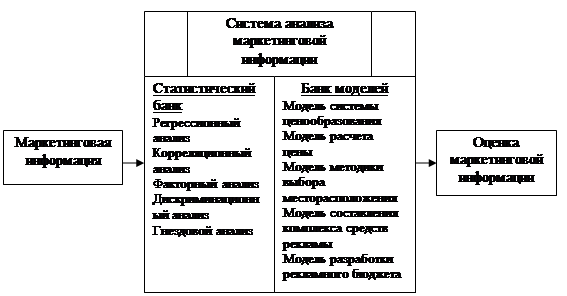 Рисунок 3 – Маркетинговая информационная система В целом маркетинговая информационная система дает множество преимуществ: организованный сбор информации; избежание кризисов; координация плана маркетинга; скорость; результаты, выражаемые в количественном виде; анализ издержек и прибыли. [11, с.79] Система сбора внешней текущей маркетинговой информации обеспечивает руководителей информацией о самых последних событиях. Это набор источников и методических приемов, посредством которых руководители получают повседневную информацию о событиях, происходящих в коммерческой среде. Руководители собирают текущую маркетинговую информацию, читая книги, газеты и специализированные издания, беседуя с клиентами, поставщиками, дистрибьюторами и прочими лицами, не относящимися к штатным работникам фирмы, а также обмениваясь сведениями с другими управляющими и сотрудниками самой фирмы. Хорошо организованные фирмы принимают дополнительные меры, чтобы повысить качество и увеличить количество собираемой внешней текущей информации. Во-первых, они обучают и поощряют своих продавцов (менеджеров по продажам) фиксировать происходящие события и сообщать о них. Ведь торговые агенты - это «глаза и уши» фирмы. Они находятся в исключительно выгодном положении для сбора сведений, которых не получишь никакими другими методами. [12, с.67] Во-вторых, фирма поощряет дистрибьюторов, розничных торговцев и прочих своих союзников передавать ей важные сведения. В некоторых фирмах специально назначают специалистов, ответственных за сбор внешней текущей маркетинговой информации. В частности, фирмы высылают на места так называемых «мнимых» покупателей, которые следят за персоналом розницы. О конкурентах можно многое узнать: - приобретая их товары; - посещая «дни открытых дверей» и специализированные выставки; - читая публикуемые ими отчеты и присутствуя на собраниях акционеров; - беседуя с бывшими и нынешними служащими конкурирующих организаций, их дилерами, дистрибьюторами, поставщиками, и агентами по фрахтовым операциям; - собирая их рекламу; - читая газеты и документы профессиональных ассоциаций. В-третьих, фирма покупает сведения у сторонних поставщиков внешней текущей информации. Для получения подборок рекламы конкурентов, сведений об их затратах на рекламу и наборе используемых ими средств рекламы прибегают к платным услугам бюро вырезок. В-четвертых, ряд фирм имеют специальные отделы по сбору и распространению текущей маркетинговой информации. Сотрудники этих отделов помогают управляющим в оценке вновь поступающей информации. Система анализа маркетинговой информации - набор совершенных методов анализа маркетинговых данных и проблем маркетинга (рисунок 4).