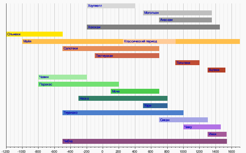 Верхняя часть шкалы (оттенки серого цвета) соответствует североамериканскому ареалу. 5. Перечень доколумбовых культур · Хоупвелл Основная статья Хоупвелл Хоупвеллская традиция или Традиция Хоупвелл (иногда неверно именуется «культура Хоупвелл ») — комплекс сходных индейских археологических культур, существовавших вдоль рек северо-восточной и центрально-восточной части будущих США в период 200—500 гг. н. э. Хотя о происхождении Хоупвеллской традиции всё ещё ведутся споры, по-видимому, она возникла на территории Иллинойса или невдалеке от него. Хоупвеллская традиция состояла из раздробленных племён, связанных общей сетью торговых путей,[1] известной как Хоупвеллская система обмена. В период своего расцвета Хоупвеллская система обмена распространялась с юго-востока современных США до юго-востока канадского побережья озера Онтарио. На этой территории процветала активная торговля и деятельность вдоль речных путей. Хоупвеллская система получала материалы со всей территории современных США. Среди предметов торговли большинство составляли экзотические материалы, в обмен на которые экспортировались продукты питания и местные изделия. Хоупвеллские изделия обнаружены далеко за пределами данной системы, в частности, во многих погребениях за пределами среднего Запада.[2] · Могольон Основная статья Могольон Археологическая культура Могольон — одна из 4-х крупнейших исторических культур юго-запада современных США, частично затрагивавшая также территорию северной Мексики. Существовала примерно с 150 г. н.э по 1400 г. н. э. Название происходит от Могольонских гор, названных в честь дона Хуана Игнасио Флореса Могольона, губернатора Нью-Мексико в 1712—1715. · Анасази Основная статья Анасази Культура Анасази , или предки пуэбло — доисторическая индейская культура, существовавшая на территории современного региона на юго-западе США, известного как Четыре угла (штаты Колорадо, Юта, Аризона, Нью-Мексико). Для культуры анасази был характерен собственный стиль керамики и сооружения жилищ. До сих пор среди археологов продолжается спор о датировке возникновения культуры, однако в настоящее время установилась компромиссная формулировка, согласно которой культура возникла примерно в 12 в. до н. э. во время Эры изготовителей корзин II по Хронологии Пекос. Начиная с самых ранних раскопок исследователи полагали, что древние пуэбло (анасази) были предками современных пуэбло. [3]В целом, и сами пуэбло также претендуют на происхождение от древних пуэбло. До настоящего времени остаётся населённым созданное анасази около 1000 лет назад селение Таос-Пуэбло, являющееся памятником Всемирного наследия ЮНЕСКО. · Хохокам Основная статья Хохокам Хохокам , англ. Hohokam — крупная доколумбова археологическая культура, существовавшая на юго-западе США (пустыня Сонора), частично затрагивавшая также территорию современной Мексики. Существовала с 1 по 15 вв. н. э. Культуру идентифицировал в 1930-е гг. как отличную от соседних археолог Гарольд Глэдвин, который использовал название из языка индейцев оодхам для обозначения археологического памятника, который он раскапывал в долине Нижней Хилы (Lower Gila Valley). Согласно местным преданиям, культура хохокам могла быть предком народов акимель-оодхам и тохоно-оодхам в Южной Аризоне. Недавние исследования памятников народа Собайпури,