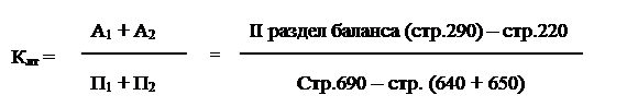 , равен отношению стоимости всех оборотных (мобильных) средств организации к величине краткосрочных обязательств: По строке 220 «Налог на добавленную стоимость по приобретенным ценностям» отражаются суммы НДС, не возмещенные на дату составления баланса, т.к. не было оснований: не прошла оплата по счету, не оприходованы ценности и др. В этом случае источником покрытия такого НДС являются собственные средства, что обусловливается правомерность перевода суммы по строке 220 во внеоборотные активы. Строка 640 «Доходы будущих периодов» отражает средства, поступившие в счет арендной платы, абонентной платы и аналогичных им доходов до наступления периода начисления задолженности. В этих видах кредиторской задолженности в соответствии с договорами об оказании услуг отражается реально поступившая оплата, ожидаемые доходы, а также их реальная оплата. Поскольку денежные потоки по ним реально участвуют в обороте, это дает основание приравнивать их к собственным средствам, а не краткосрочным обязательствам. Строка 650 «Резервы предстоящих расходов» отражает начисленные резервы на предстоящие расходы по ремонту основных средств, оплате отпускных и т.п. Эти расходы включаются в себестоимость продукции (работ, услуг) и возмещаются при продажах, пополняя денежные потоки организации. До момента их расходования по целевому назначению они участвуют в обороте, что дает основание приравнивать их к собственному капиталу. В первом разделе актива баланса отражаются остатки внеоборотных активов, по существу иммобилизованных из оборота на длительный срок. Во втором разделе актива баланса отражаются остатки оборотных активов, которые в течение отчетного периода – года – должны быть в обороте организации. Однако ряд статей данному критерию не соответствуют, поэтому исключаются из состава оборотных. Формулы, учитывающие данный фактор, называются «уточненные формулы». Перечислим таки статьи: 1. Данные строки 216 «Расходы будущих периодов» включают суммы расходов, произведенных в отчетном году, но подлежащих погашению в следующих отчетных периодах отнесением на издержки производства и обращения или другие источники в течение срока, к которому они относятся: - затраты на освоение новых производств; - расходы по неравномерно производимому ремонту основных средств; - суммы расходов на рекламу, подготовку кадров; - расходы на аренду помещений, на подписку и т.п. При этом средства из оборота уже изъяты и организация не может воспользоваться ими в текущем периоде в расчетах с кредиторами 2.Данные строки 230 «Дебиторская задолженность (платежи по которым ожидаются более чем через 121 месяцев после отчетной даты)» отражают долгосрочную задолженность. Следовательно, организация не может воспользоваться этими активами как средством платежа по текущим обязательствам в течение года, т.е. раньше срока их возврата. Поэтому в данной группе дебиторской задолженности отражается временное замораживание части собственного капитала организации, что дает основание для перевода её во внеоборотные активы. 3.Данные строки 240 «Дебиторская задолженность (платежи по которой ожидаются в течение 12 месяцев после отчетной даты)» в части задолженности участников (учредителей) по взносам в уставный капитал отражают неоплаченную часть уставного капитала, т.е. задолженност