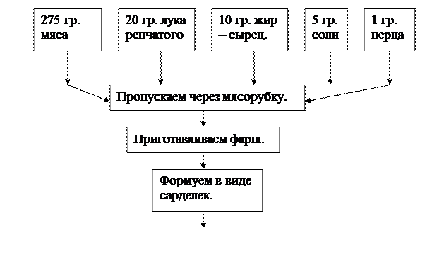 3.3. Общие правила приготовления блюд. Из рубленного мяса, получаемого путем измельчения говядины, свинины, баранины или телятины на мясорубке, приготавливают натуральные рубленные изделия без добавления хлеба (бифштексы, шницели, котлеты), и с добавлением хлеба (котлеты, биточки, зразы, тефтели). Для изготовления рубленных изделий как с добавлением, так и без добавления хлеба используют следующие куски мякоти: говядина – мякоть шейной части, Пашина и обрезки, получающиеся при разделки туши, а также покромка от туши II категории; баранина, козлятина, телятина – мякоть шейной части и обрезки; свинина – обрезки. Все куски мякоти должны быть зачищены от сухожилий и грубой соединительной ткани. Такое мясо называется котлетным. Для улучшения вкуса и сочности готовых изделий в состав нежирного котлетного мяса включают жир-сырец (5 – 10 %). В свином котлетном мясе допускается содержание жировой ткани не более 30 % и соедини тельной ткани – не более 5 %. В котлетном мясе из говядины, баранины и телятины содержание жировой, так и соединительной ткани не должно превышать 10 %. Для приготовления изделий с добавлением хлеба измельченное на мясорубке мясо соединяют с черствым пшеничным хлебом 1-го или высшего сорта, предварительно замоченным в молоке или воде, добавляют соль, перец (иногда репчатый лук) и перемешивают. В процессе приготовления рубленых полуфабрикатов необходимо применять меры, снижающие бактериальную обсемененность сырья и готовых полуфабрикатов (котлетное мясо промывают холодной проточной водой: измельченное мясо и котлетную массу охлаждают, холодную воду или пищевой лед). Сформированные полуфабрикаты сразу направляют в тепловую обработку или помещают в холодильник для охлаждения до +6о С. Мясные рубленые изделия рекомендуется жарить непосредственно перед отпуском. Полуфабрикаты кладут на сковородку или противень с жиром, нагретым до температуры 150-160о С и обжаривают 3-5 мин. с двух сторон до образования поджаристой корочки, а затем доводят до готовности в жарочном шкафу при температуре 250-280о С (5-7 мин.). Готовые рубленые изделия должны быть полностью прожарены: температура в центре для натуральных рубленых изделий должна быть не ниже 85о С, для изделий из котлетной массы – не ниже 90о С. Органолептическими признаками готовности изделий из рубленого мяса являются выделение бесцветного сока в месте прокола и серый цвет на разрезе. При отпуске натуральные рубленые изделия поливают жиром или мясным соком, изделия из котлетной массы – жиром или соусом. На гарнир отпускают картофель жареный, картофель отварной, картофельное пюре, овощи отварные или тушеные, отварные макаронные изделия, каши рассыпчатые. Подготовка сырья. Характеристика используемого сырья. Основными тканями мяса являются: мышечная, соединительная, жировая и костная. Первичная обработка состоит из следующих процессов: оттаивание, промывание, обсушивание, кулинарный разруб, обвалка, зачистка, сортировка, изготовление полуфабрикатов. Туши, полутуши, четвертины мяса оттаивают в камере при температуре от 0о до 6-8о С 1-3 сут. или при 20-25о С в течение 12-24 ч.при медленном оттаивании потери питательных веществ мясо не размораживают в воде. После оттаивания клеймо срезают, мясо промывают водой (20-30о С) с помощью щеток, споласкивают водой (12-15о С) и обсушивают на воздухе или с