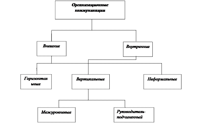 рис. 2.3 Классификационная схема организационных коммуникаций. Внутренние коммуникации . Под ними понимаются информационные обмены, осуществляемые между элементами организации. Внутри организации обмены информацией происходят между уровнями руководства (вертикальные коммуникации) и между подразделениями (горизонтальные коммуникации). Вертикальные коммуникации . С их помощью информация передается с высших уровней руководства на низшие, или по нисходящей. Таким образом работникам организации сообщают о новых стратегических и тактических целях, изменении приоритетов, конкретных заданиях на определенный период, изменении правил, инструкций, стандартов деятельности и т.п. Параллельно этим информационным потокам в любой организации осуществляется передача информации в противоположном направлении – с низших уровней иерархии к высшим, или по восходящей. С ее помощью руководство узнает о реальном положении дел в организации, о результатах принятых решений, о возникающих трудностях, проблемах и предложениях по их разрешению. Горизонтальные коммуникации . Так как организация состоит из множества (иногда из множества) подразделений, нуждающимся в согласованном выполнении своих задач, это вызывает у низ необходимость обмениваться между собой информацией. Таком образом, в дополнение к вертикальным организации нуждаются и в горизонтальных коммуникациях. Их существенное отличие заключается не в направлении движения информации, а в том, что в отличие от вертикальных, основанных на отношениях руководства и подчинения, горизонтальные информационные обмены связывают равноправные элементы организации, формируя между ними отношения кооперации и координации. Коммуникации между руководителем и подчиненным. Этот вид внутренних коммуникаций составляет абсолютное большинство всех информационных обменов в организации и занимает особое место в сфере межличностных отношений. Поэтому, хотя коммуникации типа руководитель- подчиненный формально являются одной из разновидностей вертикальных коммуникаций, их в силу особой значимости, принято рассматривать отдельно. Неформальные коммуникации. Как уже отмечалось выше, в любой организации на ряду с формальной структурой существует и неформальная, которая основана на личных, неслужебных нерегламентированных отношениях и соответственно кроме информации, передаваемой по официальным, формальным каналам (формальные коммуникации), циркулирует и неофициальная информация, проще говоря, слухи, передаваемые при помощи неформальных коммуникаций Неформальными коммуникациями довольно часто пользуются руководители, чтобы выяснить реакцию сотрудников на те или иные предполагаемые изменения. Особенности неформальных коммуникаций – гораздо большая скорость передачи информации, значительный объем аудитории, сравнительно меньшая достоверность передаваемых сообщений. Наличие в организации неформальных коммуникаций – явление нормальное, однако лишь до определенной степени. Следует помнить что слухи – это всегда следствие недостатка информации и большой объем сведений, распространяемых с помощью слухов, неформальных информационных обменов, свидетельствует о неблагополучии сети коммуникаций и ее неэффективности. Тесты 1 . Что такое закон синергии? а) объединение усилий людей д