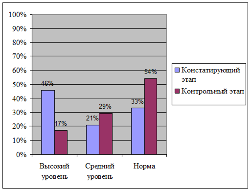 Рисунок 7. Показатель уровней переживания стресса у учащихся 2 класса на контрольном этапе по восьмицветовому тесту М. Люшера На основе полученных результатов по диагностическим методикам можно сделать вывод, что 4 учащихся испытывают высокий уровень переживания стресса, что соответствует 17%. У 8 учащихся – средний уровень переживания стресса, что соответствует 29%. У 14 учащихся отмечается норма, что соответсвует 54%. Полученные результаты мы зафиксировали в процентном соотношении и сопоставили с результатами констатирующего этапа (рисунок 8). Рисунок 8. Показатель уровней переживания стресса у учащихся 2 класса по двум диагностическим методикам на констатирующем и контрольном этапе На основании нашего исследования можно отметить, что показатель уровней переживания стресса на констатирующем и контрольном этапе у учащихся изменился. Количество детей с высоким уровнем стресса снизился с 12 до 4 человек (с 46% до 17%). Средний уровень переживания стресса увеличился с 5 до 8 учащихся (с 21% до 29%) и увеличилась норма с 9 до 14 учащихся (с 33% до 54%) (рисунок 9). Таким образом, сказкотерапия оказывает положительное влияние на снятие стресса у учащихся младшего школьного возраста, если социальный педагог будет побуждать детей сопереживать персонажам сказки, а также проводимые занятия наполнять психогимнастическими играми и упражнениями. Заключение Изучив психолого-педагогическую литературу по проблеме исследования мы выяснили, что дети в младшем школьном возрасте очень эмоциональны. Дети не умеют сдерживать и контролировать свои эмоции. Эмоциональность младших школьников выражается в эмоциональной неустойчивости, частой смене настроений, склонности к аффектам. Причиной эмоциональной неустойчивости выступает эмоциональное стрессовое состояние, которое возникает в трудных ситуациях и переживается с большой внутренней напряженностью. Стресс – это состояние неспецифического напряжения, возникающее под влиянием любых сильных воздействий и сопровождавшихся перестройкой всех систем организма. Стрессовое состояние оказывает влияние на процесс социализации детей, поскольку в младшем школьном возрасте у детей изменяется весь строй жизни, меняется режим, социальное положение, складывается определенное отношение с окружающими людьми и в семье. Для того чтобы снять стресс у детей младшего школьного возраста мы рассмотрели определенные методы коррекции и положительно на наш взгляд будет оказывать - сказкотерапия. Сказкотерапия – процесс воспитания внутреннего мира ребенка, развития души, повышение уровня осознанности событий, приобретение знаний о законах жизни. Также мы провели опытно-экспериментальную работу на снятие стресса у учащихся второго класса, используя комплекс занятий по сказкотерапии. После проведения комплекса занятий высокий уровень переживания стресса снизился. Таким образом, сказкотерапия оказывает положительное влияние на снятие стресса у учащихся младшего школьного возраста, если социальный педагог будет побуждать детей сопереживать персонажам сказки, а также проводимые занятия наполнять психогимнастическими играми и упражнениями. Список литературы 1. Абабков, В.А., Перре, М.М. Адаптация к стрессу. Основы теории, диагностики, терапии [Текст] / В.А. Абабков, М.М. Перре.– СПб.: Речь, 2004.-166 с. 2. Агарева, Е.Ю. Сказ
