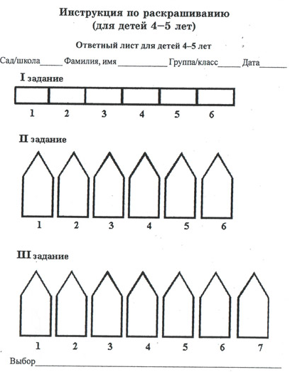 Для детей до пяти лет рекомендуется проведение методики в индивидуальном варианте. Характер заданий остается без изменений. Можно использовать инструкции I-III заданий остается без заданий. Только категории для оценки во II-III заданиях используется не отвлеченные, а конкретно привязанные к каждому домику. II задание · Этот домик веселый, а этот грустный, его кто-то обидел. · Этот домик добрый, а этот злой, он сердится, ругается. · Этот домик скучает, а этот удивляется, ему все интересно. III задание · Этот домик занимается полезными делами. · Этот домик читает сказки. · Этот домик конструирует. · Этот домик поет. · Этот-рисует. · Этот домик играет. А для этого домика придумай занятие сам. Допускается для детей дошкольного возраста помогать в случае необходимости в раскрашивании, если ребенок не успевает и это сдерживает работу группы, на ответном листе делается соответствующая пометка. Схема описания ответных листов 1. Характер раскрашивания. Определение психологического состояния ребенка по предпочтению цвета, характеру штриховки и заполнения пространства - особый вид тестирования, при котором ребенок не скован и свободно проявляет себя. Если ребенок предпочел холодные тона (голубой, синий, сине-зеленый, фиолетовый) - он склонен к созерцанию, размышлению, его психическое состояние достаточно стабильно. Предпочтение спектрально-контрастных тонов в сочетании с резкими, угловатыми или «мохнатыми» штрихами говорит о перенапряжении, внутреннем возбуждении, поиске выхода из какой-то ситуации или ее объяснения. Если контрасты не насыщенны, линии плавные, округлые, то ребенок ищет «золотую середину», стремится к цельности и гармонии. С такими детьми нельзя проявлять излишнюю категоричность, так как это может привести к развитию у ребенка замкнутости. Если ребенок, раскрашивая рисунок, выходит за границы его контура, он стремится к свободе и независимости до упрямства из-за подавления взрослыми. Возможно, он несколько рассеян, но это - проявление замкнутости на фантазиях. С такими детьми также нельзя проявлять излишнюю категоричность, для такого ребенка необходимо внести сказку в обыденные дела. Если ребенок не выходит за границы контура рисунка, не исключено, что он насторожен, замкнут из-за неуверенности в себе. Скованность может мешать ему в общении и учебе. Он может стать вечно «ведомым», обидчивым, раздражительным из-за несоответствия своего поведения внутренним побуждениям и излишней требовательности взрослых. Если ребенок заполняет часть рисунка, для него значимы детали, «мелочи», переход от частного к общему. Такой ребенок склонен к точным и естественным наукам. Если ребенок заполняет весь рисунок - у него развито обобщающее мышление, он умеет находить взаимосвязь между внешне не связанными вещами. Это - фантазер со склонностями к литературе и искусствам. Если, раскрашивая рисунок, ребенок заполняет только нижнюю его часть, цикл его биоритмов и внутреннего психологического состояния пограничный: переход от спада к подъему. Ребенок заполняет только верхнюю часть рисунка - пик интенсивности биоритмов. Максимальная активность восприятия любой информации может граничить с перевозбуждением, несмотря на внешнее спокойствие. 2. Цветовые выборы. Первая информация для консультирования - это инверсии, наблюдаемые при выполнении I 