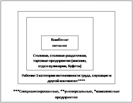 Рисунок 2 * Комплексные предприятия – это объединенные предприятия разных типов в одном здании с полной или частичной централизацией производства, хранения продуктов и управления. ** Универсальные предприятия – это предприятия, производящие и реализующие широкий ассортимент продукции собственного производства и покупных товаров, а также имеющие определенный уровень обслуживания в зависимости от типа предприятия и его класса. К ним относятся общедоступные столовые, рестораны, кафе и закусочные с соответствующим данному типу предприятия ассортиментом. *** Специализированные предприятия – это предприятия, производящие и реализующие в основном однородную кулинарную продукцию, ограниченный ассортимент напитков и покупных товаров. К ним относятся шашлычные, пельменные, пирожковые, рестораны с национальной кухней, кафе-молочные и другие.