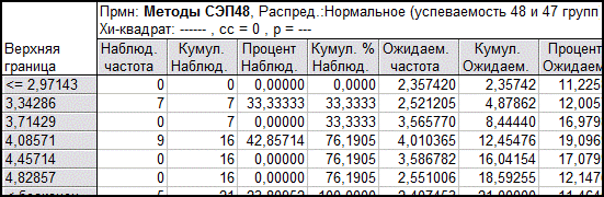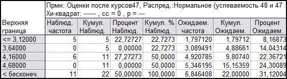 Итак, в ходе проведенного исследования, выяснилось, что курсы по улучшению навыков работы с программой Статистика могут быть проведены в обеих группах, так как средняя успеваемость студентов равна. Исследование 2. В течение второго семестра студенты групп 47 и 48 посещали занятия и улучшали свои познания в области статистического анализа с помощью программы Статистика. В конце курсов они должны были предоставить индивидуальные отчеты с различными анализами файлов статистических данных. Помимо этого студенты должны были уметь объяснять суть проведенных анализов. Были выставлены оценки, которые занесены в вышеприведенную таблицу (1). Выставленные оценки в двух группах так же проверим на нормальность распределения. Таблица (5)