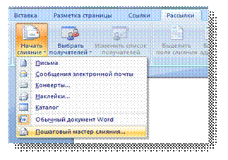 Рис.1.1. Пример источника данных При использовании фильтра или запроса все данные, отвечающие заданным требованиям, используются при слиянии писем. Технология создания письма при помощи инструмента слияния: Начальными этапами будут создание двух документов: источника данных и основного документа. Для слияния с почтой используются команды вкладки Рассылки . Слияние можно также выполнить с помощью области задач Слияние , которая позволяет шаг за шагом осуществить весь процесс. Чтобы воспользоваться областью задач, в группе Начать слияние на вкладке Рассылки необходимо выбрать пункт Начать слияние , а затем пункт Пошаговый мастер слияния [12] (см. рис.1.2.). По умолчанию открывается пустой документ. Пусть он остается открытым. Если его закрыть, команды, которые нужно будет выполнить на следующем шаге, окажутся недоступными. После выбора Пошагового мастера слияния ,откроется область задач Слияние , в которой представлен Этап 1 из шести этапов мастера. Дальше, необходимо щелкнуть по типу документа, который нужно создать.