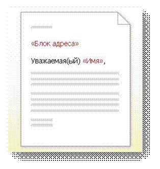 Рис. 1.4. Пример заполнения основного документа полями слияния При слиянии данные первой строки файла данных замещают поля в основном документе, тем самым, образуя первый составной документ (см. рис.1.5.). Данные второй строки файла данных замещают поля, образуя второй составной документ, и т. д.