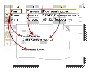 Рис.1.5. Распределение данных из источника данных в поля слияния основного документа Для установления соответствия полей нужно выбрать пункт Подбор полей в группе Составление документа и вставка полей на вкладке Рассылки . Откроется диалоговое окно Подбор полей (см. рис.1.6.). Элементы адреса и приветствия приводятся слева. Заголовки столбцов из файла данных приводятся справа. Word подыскивает соответствующий столбец для каждого элемента. На иллюстрации показано, что Word автоматически нашел соответствие столбца Фамилия файла данных полю Фамилия.