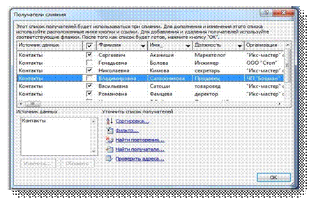 Рис. 2.1. Выборка получателей слияния из списка В данном письме необходимо заполнить лишь строку приветствия. Для этого нажав на Строка приветствия , в всплывшем окне нужно выбрать параметры приветствия. В формате строки необходимо выбрать обращение Уважаемый , форма обращения – Иван Иванович мл . и в конце поставить Восклицательный знак . В строке Просмотр можно прокрутить полученные обращения. Если обращения выглядят верно, необходимо нажать ОК (см. рис. 2.2.). После того, как все поля добавлены в основной документ, можно просмотреть предварительные результаты слияния. Если эти результаты соответствуют ожиданиям, можно завершить слияние. В области просмотр можно щелкнуть по кнопке Следующая запись , чтобы просмотреть добавленные поля слияния для каждого получателя в связанном источнике данных.