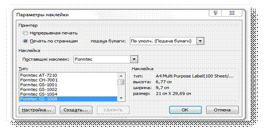 Рис. 2.6. Параметры печати письма После выбора необходимого пункта, нужно нажать на ОК и документ отправляется на печать. Письмо-предложение Для сообщения постоянным покупателям фирмы о поступлении нового товара или скидках, в фирме используются прямые рассылки. Прямая рассылка используется и для предоставления эксклюзивных скидок постоянным покупателям. Для этого в письмо вкладывают специальный купон с указанием размера скидки. Рассылка осуществляется почтой. Пример письма для прямой рассылки содержит поле обращения к покупателю по фамилии, имени, отчеству, текст письма с предложением к адресату, и подпись отправителя (наименование организации, справочные данные, контактный телефон ответственного за распродажу или лицо, у которого можно проконсультироваться по поводу заказа). Источником данных для письма служит база данных, содержащая информацию о клиентах по безналичным платежам. Основным документом является письмо, набранное секретарем, с размещением на нем полей слияние (строка приветствия, ФИО и контактные данные ответственного лица) (см. Приложение 3). База данных, которая содержит информацию о постоянных покупателях, создана на основе анкеты владельца дисконтной картой. Данная анкета заполняется лично покупателем, после чего на него заводится дисконтная карта, которая будет отражать размер скидки, общую сумму сделанных покупок и перечень товаров, купленных покупателем (см. Приложение 4). По этой информации можно судить об интересах потребителя и при рассылке оповещений делать акцент на конкретную линию товара. В переписке между филиалами фирмы сотрудники пользуются электронной рассылкой, письмо для которой тоже можно создавать при помощи слияния. Письмо-оповещение Рассмотрим письмо об утере подарочных сертификатов покупателем. Текст документа печатается отправителем самостоятельно (не на основе шаблона). В письме полями слияния будут поля: Кому (ФИО и электронный адрес) и Строка приветствия . Данное письмо будет направлено во все филиалы фирмы. Источником данных для заполнения полей слияния будет служить список контактов из базы MSOutlook. В итоге получаются персонифицированные письма с обращениями к конкретным адресатам и отправленные в разные магазины (см. Приложение 5). В основном функция слияния необходима для установки строки приветствия и указания электронного адреса получателя. 2.3 Создание наклеек при помощи слияния Способом слияния документов помимо создания обычных писем, также можно создавать наклейки, которые можно прикреплять к посылкам или каталогам. Создадим наклейку с адресом и логотипом фирмы, которую можно прикрепить на каталог товаров и услуг «Икс-мастер». На вкладке Рассылки нужно выбрать пункт Начать слияние , а затем пункт Пошаговый мастер слияния . После выбора Пошагового мастера слияния , откроется область задач Слияние , в которой представлен Этап 1 . На Этапе 2 предлагается выбрать основу для наклейки, для этого нужно выбрать Изменить макет документа и нажать на Параметры наклейки . Появится диалоговое окно Параметры наклейки (см. рис.2.7. ). В данном окне необходимо выбрать тип и формат наклейки. В качестве поставщика будет Formtec , тип Formtec GS -1008 , ОК . Word разбивает лист на определенное количество наклеек, обозначая их границы пунктирной линией.