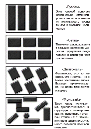 Рис. 5 – Основные типы размещения торгового оборудования Размещение товара. После установки торгового оборудования встает вопрос эффективного размещения товаров. Так как главной целью любой торговой точки является получение прибыли, выбирать место для каждого вида товаров следует с особой тщательностью. Грамотная, а значит, эффективная компоновка торгового оборудования основополагается на следующих элементах: логическая последовательность покупок;наиболее посещаемые отделы; популярные товары; товары с высокой или низкой ротацией; политика магазина (мерчендайзера) в отношении размещения категорий товаров. Особенно не желательно соседство самых популярных отделов (например, мясного и овощного): в противном случае покупатель целенаправленно устремится в этот уголок магазина и купит лишь необходимое, обойдя вниманием, проигнорировав остальные отделы. Соответственно, то же касается и двух слабо посещаемых отделов, к примеру, отделов столовой посуды и одежды. Поток покупателей. Одним из ключевых моментов для определения хорошего размещения является поток покупателей[27] . Перед тем как выбрать оптимальное размещение товара в магазине, торговый представитель должен определить путь, по которому движется большинство покупателей, - поток покупателей . Чрезвычайно важно определить первоначальное направление, выбираемое большинством покупателей, входящих в магазин, так как наилучшее размещение для ходовых товаров там, где покупатель заметит их раньше всего. Чтобы посетитель увидел как можно больше товаров, поток покупателей следует планировать заранее и отслеживать. Есть четыре причины, по которым товары следует располагать как можно ближе к началу покупательского потока. 1. Пока тележка для товаров еще относительно пуста, покупатель не отвлекается на решение проблем: как рациональнее разместить относительно тяжелые или крупные покупки, чтобы не разбить или не помять другие, уже находящиеся в тележке; не стала ли тележка слишком тяжелой для маневрирования и т.п. 2. Такие продукты, как кондитерские изделия, зачастую приобретаютсяимпульсивно, а внезапное побуждение купить что-либо, не входящее в список покупок, наиболее сильно в самом начале посещения магазина. 3. Неудачно выложенный товар (таковым является его размещение в конце покупательского потока) может оказаться равноценно замещенным товарами конкурентов, на которые и падет выбор посетителя магазина. 4. Необходимо учитывать, что бюджет покупателя не бесконечен. Если товар (особенно тот, что приобретается импульсивно) выложен в конце потока, его могут не купить из-за неуверенности посетителя, хватит ли ему денег. Изложенные причины подчеркивают важность для мерчендайзера определения потока покупателей в магазине. Естественные тенденции для большинства вошедших в супермаркет покупателей – движение вправо (правило буравчика), но их склонность ориентироваться и изучать полки против часовой стрелки следует поощрять физически, логически и психологически[28] . 1. Физическое поощрение: правостороннее расположение входа в магазин. 2. Логическое поощрение: размещение корзин для покупок;размещение пункта приема пустой тары. 3. Психологическое поощрение: отсутствие видимых ограничений и эксперименты с оборудованием в местах продажи (варианты освещения, более привле