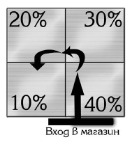 Рисунок 6 – Размещение «золотого треугольника» в магазине товаров повседневного спроса. Чтобы разместить свои товары внутри «золотого треугольника» в магазине товаров повседневного спроса, мерчендайзер должен изменить его размеры. На рис. 6 показано, как можно изменить форму и размеры треугольника. В первом примере (А) вход в магазин, самый популярный отдел (молочный) и кассы расположены рядом. Во втором примере (Б) они отнесены дальше друг от друга, благодаря чему размер треугольника увеличивается[31] . Поток покупателей не одинаков в различных частях магазина. Исследования показывают, что, двигаясь против часовой стрелки, на полки, расположенные в дальней части магазина, покупатели обращают меньше внимания, чем на полки вблизи от входа. На рис. 7 показано влияние потока покупателей на продажи: такова статистика и результаты, выраженные в процентах от покупательского потока, характерные для каждой четверти магазина[32] .