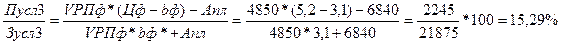 Используя данные таблицы № 2, рассчитаем влияние факторов, на изменение суммы прибыли в целом по предприятию с помощью приема цепной подстановки. Вначале определим прибыль исходя из планового уровня всех факторных показателей: Ппл = ∑(VРПобщ.пл * Удiпл * (Цiпл – biпл)) – Aпл = = 5700 х (5,0 - 2,8) + 5600 х (6,0 - 3,6) + 2700 х (7,0 - 3,5) +1900 х (7,5 - 3,75) - 24 655 - 17900 тыс. руб. Затем рассчитаем сумму прибыли при изменении общего объема продаж, но при сохранении плановой его структуры и планового уровня остальных факторов: Ппл = ∑(VРПобщ.ф * Удiпл * (Цiпл – biпл)) – Aпл = = 5650 * (5,0 - 2,8) + 5550 * (6,0 - 3,6) + 2676 * (7,0 - 3,5) +1884 * (7,5-3,75)-24655 = 17525 тыс. руб. После этого узнаем, какой будет прибыль при фактическом объеме и структуре продаж, но при плановом значении остальных факторов: Пусл2 = ∑(VРПобщ.ф * Удiф * (Цiпл – biпл)) – Aпл = = 4850 * (5,0 - 2,8) + 5300 * (6,0 - 3,6) + 3050 * (7,0 - 3,5) + +2560 * (7,5 - 3,75) - 24 655 = 19 010 тыс. руб. Прибыль при фактическом объеме, структуре продаж и фактических ценах, но при плановом уровне переменных и постоянных затрат составит: Пусл3 = ∑(VРПобщ.ф * Удiф * (Цiф– biпл)) – Aпл = =4850 * (5,2 – 2,8) + 5300 * (6,1 – 3,6) + 3050 * (7,35 -3,5) + 2560 * (7,8 – 3,75) - 24655 = 22345 тыс.руб. При плановой сумме постоянных затрат, но при фактическом значении остальных факторных показателей прибыль равна: Пусл4 = ∑(VРПобщ.ф * Удiф * (Цiф– biф)) – Aпл = =4850 * (5,2 – 2,8) + 5300 * (6,1 – 3,6) + 3050 * (7,35 -3,5) + 2560 * (7,8 – 3,744) - 24655 = 21131 тыс.руб. Фактическая сумма прибыли составляет: Пф = ∑(VРПобщ.ф * Удiф * (Цiф– biф)) – Aф = =4850 * (5,2 – 2,8) + 5300 * (6,1 – 3,6) + 3050 * (7,35 -3,5) + 2560 * (7,8 – 3,744) - 26490 = 19296 тыс.руб. Изменение суммы прибыли произошло из-за: а) уменьшения общего объема продаж ΔПvрп = Пусл1 –Ппл = 17525 – 17900 = -375 тыс. руб. б) изменения структуры реализованной продукции ΔПстр = Пусл2 –Пусл1 = 19010 – 17525 = +1485 тыс.руб. в) изменения уровня отпускных цен ΔПц = Пусл3 –Пусл2 = 22345 – 19010 = +3335 тыс. руб. г) изменения уровня переменных расходов ΔПц = Пусл4 –Пусл3 = 21131 – 22345 = =1214 тыс. руб. д) изменения постоянных затрат ΔПА = Пф – Пусл4 = 19296 – 21131 = -1835 тыс. руб. Итого + 3120 тыс. руб. По методике маржинального анализа прибыль в большей степени зависит от объема и структуры продаж, так как эти факторы влияют одновременно и на себестоимость продукции. Из-за уменьшения общего объема производства и реализации продукции больше постоянных затрат приходится на единицу продукции. Таким образом, сравнительный анализ познавательных свойств различных методик факторного анализа прибыли убеждает нас в преимуществе методики маржинального анализа, позволяющего исследовать и количественно измерить не только непосредственные, но и опосредованные связи и зависимости. Использование этого метода в финансовом менеджменте отечественных предприятий позволит более эффективно управлять процессом формирования финансовых результатов. 3. Методика маржинального анализа рентабельности Наиболее полно, чем прибыль конечные результаты отражает рентабельность. Этот показатель соизмеряет результаты хозяйственной деятельности и затраты, или полученную выручку, или совокупный капитал. Действующая методика анализа рентабельности, также не учитывает взаимосвязь "затраты — объем — прибыль". По данной методике уровень рентабельности не зависит от объема продаж, так как с изменением последнего происходит равномерное увеличение прибыли и суммы затрат. В действительности, как мы уже убедились, и прибыль и издержки предприятия не изменяются пропорционально объему реализации про