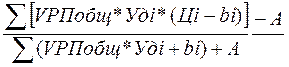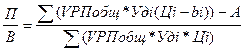 Ппл = VРПпл * (Цпл – bпл) – Апл = 5700 * (5,0 – 2,8) – 6840 = 5700 тыс.руб. Пусл1= VРПф * (Цпл – bпл) – Апл = 4850 * (5,0 – 2,8) – 6840 = 3830 тыс. руб. Пусл2 = VРПф * (Цф – bпл) – Апл = 4850 * (5,2 – 2,8) – 6840 = 4800 тыс. руб. Пусл3 = VРПф * (Цф – bф) – Апл = 4850 * (5,2 – 3,1) – 6840 = 3345 тыс. руб. Пф = VРПф * (Цф – bф) – Апл = 4850 * (5,2 – 3,1) – 6790 = 3395 тыс. руб. Общее изменение прибыли составляет ΔПобщ = 3395 – 5700 = - 2305 тыс. руб. В том числе за счет изменения: количества реализованной продукции ΔПvрп = Пусл1 –Ппл = 3830 – 5700 = -1870 тыс. руб.; цены реализации ΔПц = Пусл2 – Пусл1 = 4800 – 3830 = +970тыс. руб.; удельных переменных затрат ΔПb = Пусл3 – Пусл2 = 3345 – 4800 = -1455 тыс. руб.; сумма постоянных затрат ΔПА = Пф –Пусл3 = 3395 – 3345 = +50 тыс.руб. В отличие от методики анализа прибыли, применяемой в нашей стране, рассмотренная методика позволяет более правильно исчислить влияние факторов на изменение суммы прибыли, так как она учитывает взаимосвязь объема производства (продаж), себестоимости и прибыли. Методика анализа прибыли несколько усложняется в условиях многопродуктового производства, когда, кроме рассмотренных факторов, необходимо учитывать и влияниеструктуры реализованной продукции. Для изучения влияния факторов на изменение суммы прибыли от реализации продукции в целом по предприятию можно использовать следующую модель: П = ∑(VРПобщ * Удi(Цi – bi)) - A Таблица 2 Исходные данные для факторного анализа прибыли от реализации продукции в целом по предприятию