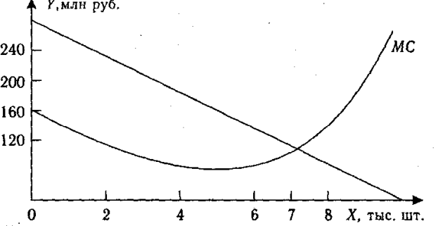 Изменение уровня рентабельности за счет: а) объема продаж ΔRvРП = Rусл1 – Rпл = 22,79 – 23,14 = - 0,35%, б) структуры продаж ΔRуд = Rусл2 – Rусл1 = 25,5 – 22,79 = +1,71%, в) цен ΔRц = Rусл3 – Rусл2 = 28,8 – 24,5 = +4,3%, г) переменных затрат ΔRb = Rусл4 – Rусл3 = 26,8 – 28,8 = - 2%, д) постоянных затрат ΔRА = Rф – Rусл4 = 23,93 – 26,8 = - 2,87%, Итого +0,79% На данном предприятии план по физическому объему реализации продукции недовыполнен на 0,88%, что привелок снижению рентабельности на 0,35%. Аналогичным образом производится анализ рентабельности продаж (оборота) , для чего можно использовать следующую модель: Rоб = Преимущество рассмотренной методики анализа показателей рентабельности состоит в том, что при ее использовании учитывается взаимосвязь элементов модели, в частности объема продаж, издержек и прибыли. Это обеспечивает более точное исчисление влияния факторов, и как следствие — более высокий уровень планирования и прогнозирования финансовых результатов. 4. Предельный анализ и оптимизация прибыли Максимизация прибыли является доминирующей проблемой любого субъекта хозяйствования. Получение максимальной прибыли возможно при определенном сочетании объемапроизводства, цены продукта и издержек на его производство и реализацию. Максимизация прибыли заключается в выборе такого объема производства (реализации) продукции, при котором предельные издержки на производство и реализациюпродукции равны предельному доходу. Предельный доход — это прирост выручки на единицу прироста количества произведенной продукции. Соответственно предельные издержки равны приросту затрат на единицу прироста количества производимой продукции. При этом следует учитывать, что не всякое расширение производства ведет к адекватному росту прибыли, так как: а) по-разному выглядит динамика издержек; б) происходит снижение цен при росте объема выпуска продукции. Значит, предприятие должно найти такой объем производства продукции, при котором оно извлекло бы наибольший доход. Существует несколько способов определения оптимального объема производства: бухгалтерско-аналитический; графический; статистический. Сущность бухгалтерско-аналитического способа состоит в сопоставлении предельного дохода и предельных издержек. Если предельный доход больше предельных издержек, то дальнейший рост выпуска увеличивает общую сумму прибыли, и наоборот. Следовательно, для максимизации прибыли предприятие должно расширять объем производства до тех пор, пока предельный доход выше предельных издержек, и прекратить расширение производства, как только предельные издержки начнут превосходить предельный доход. Согласно данным таблице № 3, самый выгодный объем производства при 7 тыс. ед. Затем предельные издержки уже превосходят предельный доход, что явно неблагоприятно для предприятия. Следовательно, до 7 тыс. ед. предприятию выгодно производить продукцию, но сверх этой величины производство неэффективно. Этот же результат можно получить и графическим методом (рис. 1). До 7 тыс. ед. кривая предельных издержек (МС) ниже кривой предельного дохода и поэтому каждая дополнительная единица выпускаемой продукции увеличивает сумму прибыли. Максимальная прибыль — это точка пересечения кривой предельных издержек с кривой предельного дохода. После этой точки кривая предельных издержек располагается выше кривой предельного до