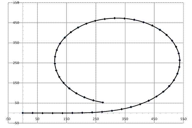 Из расчетов видно, что эффективность руля обеспечена. Действие руля Управляемость включает два свойства судна – устойчивость на курсе и поворотливость. Под устойчивостью на курсе принято понимать способность судна удерживать заданное прямолинейное направление движения, под поворотливостью судна – его способность изменять направление движения и описывать траекторию любой наперед заданной кривизны, что обеспечивается перекладкой руля на тот или иной борт. В результате перекладки руля на некоторый угол траектория движения центра тяжести судна и оконечностей корпуса показывает характер того движения, которое получит судно в случае, если руль при начавшемся смещении будет постоянно переложен на некоторый угол и затем остановлен в этом положении на все время дальнейшего движения судна. Траектория движения цента тяжести судна, полученная при этом, носит название циркуляции. Этот же термин часто обозначает сам процесс поворота судна. Центр тяжести судна в начале маневра перемещается в сторону, противоположную отклонению рулевого органа, а затем в сторону, отклонения рулевого органа, двигаясь по кривой с уменьшающимся до известного предела радиусом кривизны. Одновременно диаметральная плоскость судна, совпадающая первоначально с направлением скорости поступательного движения, сразу начнет отклоняться по направлению к центру кривизны траектории, описываемой центром тяжести судна. Весь процесс движения судна во время циркуляции обычно делят на три периода: первый период – маневренный, по времени совпадающий с продолжительностью перекладки руля, то есть от начала поворота руля до отклонения его на предельный угол. Как указывалось выше, этот период характеризуется смещением судна в сторону, противоположную направлению перекладке руля; второй период – неустановившегося движения на циркуляции, который начинается с момента окончания перекладки руля и заканчивается, когда значение угла дрейфа будет максимальным, а радиус циркуляции – минимальным; третий период – установившегося движения на циркуляции, он начинается с момента окончания второго периода и длится все время, пока руль находится в переложенном на борт положении. Траекторию движения судна в третий период принято называть установившейся циркуляцией, при котором угла дрейфа и радиус кривизны представляют собой постоянные величины. Рассчитаем циркуляцию для нашего судна на скоростях хода 7, 10 и 15 узлов. Расчеты выполнены в программе «Синтаксические анализаторы...» производителя Mikhailov SoftWare Co (R). Условные обозначения: время (t), с; курсовой угол (q), град; координата x (x), м; координата y (y), м; скорость (v), уз.; угол перекладки (α), град. Исходные данные для расчета циркуляции: 170 м – длина судна по действующую ватерлинию; 27.6 м – ширина судна на миделе; 9.967 м – осадка судна по действующую ватерлинию; 0.789 м – коэффициент общей полноты судна; 0.99 м – коэффициент полноты судна; 9.967 м – осадка носом; 9.967 м – осадка кормой; 63.33 м2 – площадь, дополняющая кормовую часть диаметральной плоскости до прямоугольника при осадке Т=Тк; 33.5 м2 – площадь, дополняющая носовую часть диаметральной плоскости до прямоугольника при осадке Т=Тн; 18 – номер переходного шпангута от U к V образному; 24.91 м2 – площадь руля и рудерпоста по действующую ватерлинию при Т=Тк; 1 – число рулей; 85 м – отстояние б