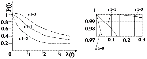 На рисунке изображены зависимости вероятностей отказов в параллельной системе с различным количеством резервных компонентов. Эти зависимости и (1) отражают активное резервирование. В этом случае резервные каналы работают параллельно с основными. Вероятность безотказной работы с увеличением резерва возрастает. При пассивном резервировании дополнительные каналы включаются в работу только после отказа основного. Такое резервирование требует высоко-надежного контроля в сочетании с наличием средств включения резервных компонентов. Показатель надежности системы с пассивным резервированием определяются: P(t) = (1 + lt)e- l t (2)