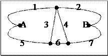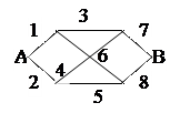 Определим минимальные сечения: 12, 78, 145, 236, 348, 567, 1468, 2467, 3456. Минимальные пути: 137, 168, 247, 258, 13458, 16547, 24368, 25637, Пусть вероятность отказа 2-ух устройств в памяти qУ соответственно 4-ех устройств сопряжения qС равны м/ собой, тогда рН = (1-qУ 2 ). (1-qП 2 ). (1-qС 2. qП )2. (1-qС 2. qУ )2. (1-qУ . qС 2. qП )2. (1-qС 4 ) обозначим вероятности безотказной работы устройств памяти через рУ = 1-qУ , устройств сопряжения рС = 1-qС , процессоров рП = 1-qП , тогда рВ = 1 - (1- рУ . рС 3. рП )4. (1- рУ . рС . рП )4 . Вспомогательный граф системы для определения рВ .