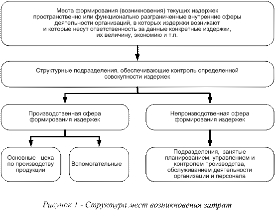 Рис. 3. Центры возникновения затрат. Практике рассматриваются два подхода к выбору состава затрат, учитываемых по местам их возникновения: комплекс прямых и косвенных затрат, связанных с работой данного подразделения, службы, вида деятельности, безотносительно к видам вырабатываемой продукции; ограничение косвенными затратами, возникающими о данном подразделении, которые носят общий для всех видов продукции характер и не могут быть отнесены на отдельный вид продуктов прямым путем. Прямые расходы учитывают по видам продукции без их обобщения по местам возникновения расходов. Выбор того или иного варианта должен диктоваться целями управления и с этих позиций предпочтительнее первый. В этом случае контролем охватывают все используемые производственные ресурсы на данном месте возникновения расходов, что усиливает степень влияния учёта на процесс формирования издержек и действенность внутреннего хозяйственного механизма. При варианте, когда обобщаются все затраты, присущие данному месту их возникновения, более реально в системе контроля за издержками использовать бюджетно-сметный метод и метод выявления отклонений от норм с определением причин и виновников отклонений. Система учёта, в которой предусматривается составление отчетов по данным сравнения сметных (стандартных) показателей с фактическими, называется учётом по центрам ответственности. А каждое подразделение, возглавляемое конкретным менеджером, называется, центром ответственности. Деятельность каждого центра ответственности может быть оценена с точки зрения эффективности. Эффективная деятельность - производство заданного объема продукции при минимальном использовании производственных ресурсов, либо максимальное производство объема продукции при заданном размере производственных ресурсов. В центре ответственности действует принцип «затраты -> объем переработки сырья -> прибыль». По отношению к процессу производства центры ответственности подразделяют на: - основные и функциональные; По отношению к внутреннему хозяйственному механизму: - хозрасчетные и аналитические. Основные центры ответственности организуют контроль по месту возникновения затрат; функциональные — обеспечивают контроль над затратами, возникшими во многих местах, но под воздействием одного центра ответственности. Хозрасчетные центры ответственности обычно совпадают с местами возникновения затрат, им присущ контроль в момент возникновения затрат; аналитические не связаны системой внутренних хозрасчетных отношений, они строят системы контроля за отдельными затратами. Центр рентабельности — разновидность центров ответственности, в которых доход есть денежное выражение выпущенной продукции; расход — денежное выражение использованных ресурсов, а прибыль — разница между доходом и расходом. Центр рентабельности — это экономика предприятия в миниатюре. Использование модели управления по центрам рентабельности позволяет на больших предприятиях децентрализовать ответственность за прибыль. Нецелесообразно формировать центры рентабельности о случаях, когда центры ответственности оказывают услуги другим центрам (например, услуги отдела внутреннего аудита оказываются без указания цены услуг), а также в случаях при установлении трансфертных цен, когда возникают 