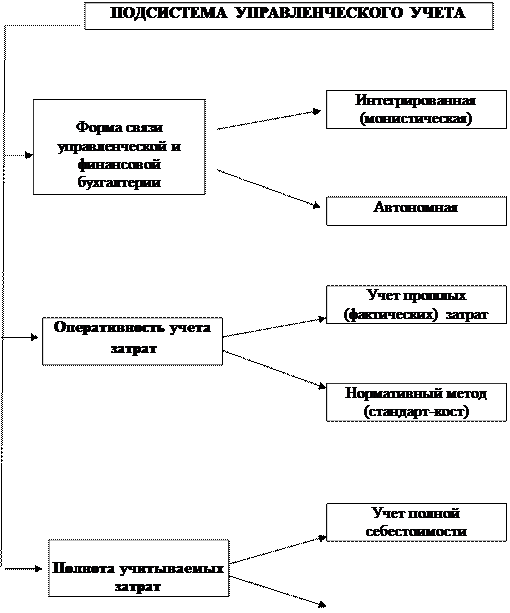 ![]() 1 – производственный учет 2 – финансовый учет для внутреннего пользования 3 – финансовый учет в узком смысле для внешних пользователей 4 – налоговые расчеты на базе финансового учета (налоговый учет). Выделяют два подхода к пониманию сущности термина «управленческий учет». 1. связан с managementaccounting, второй – с европейским «контроллинг» (Германия). В соответствии с первым термином основной задачей любой учетной деятельности является обеспечение управленческого персонала предприятия своевременной и полной информацией для принятия управленческих решений. Это означает, что деятельность по учету неразрывно связана с управлением предприятием в целом и отдельными его частями. Поэтому managementaccounting может быть переведен как организация учета, исходя из потребностей управления. При таком подходе управленческий учет – не только система сбора и анализа информации об издержках предприятия, но и система бюджетирования, система оценки деятельности подразделений. В целом, это в большей степени управленческие, чем бухгалтерские технологии. 2. понятием «управленческий учет» рассматривается, как система сбора и интерпретации информации о затратах, издержках и себестоимости продукции, т.е. это расширенная система организации учета для целей контроля за деятельностью предприятия. В узком смысле под управленческим учетом можно понимать учет и контроль затрат и доходов, связанных с деятельностью предприятия. В российской практике чаще управленческий учет рассматривается в широком смысле (в соответствии с термином managementaccounting) как система, которая в рамках одной организации обеспечивает управленческий персонал информацией, используемой для планирования, управления и контроля за деятельностью организации. Предметом управленческого учета является производственная деятельность организации в целом и его отдельных структурных подразделений Объектами управленческого учета являются издержки предприятия и его отдельных структурных подразделений – центров ответственности; результаты хозяйственной деятельности всего предприятия и центров ответственности; внутреннее ценообразование; бюджетирование и внутренняя отчетность. Различные сочетания экономических, юридических, организационных и технико-технологических факторов определяют разнообразие форм организации управленческого учета.