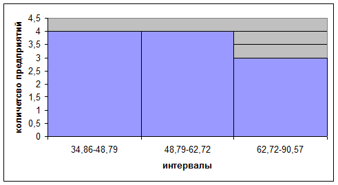 На основании таблицы 3 построим гисторгамму распределения сельскохозяйственных предприятий по отработанному времени 1 работником в год в Краснозерском районе за 2007г.
