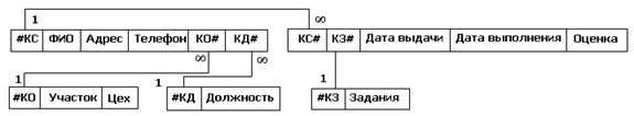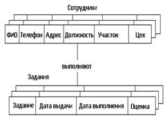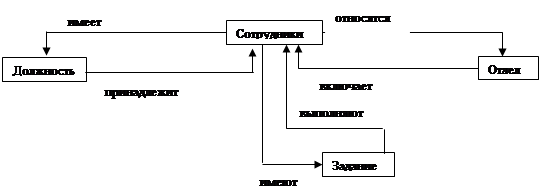 Рисунок 4.1 – Пример иерархической модели данных для проектируемой БД Корневыми являются тип Сотрудники, который в свою очередь имеет свои подчиненные типы. Сотрудники имеет такие подчиненные типы как Отдел, Должность и Задание. К достоинствам ИМД относят эффективное использование памяти ЭВМ и неплохие показатели времени выполнения основных операций над данными. А именно: поиск указанного экземпляра БД, переход от одного дерева к другому, переход от одной записи к другой внутри дерева, вставка новой записи в указанную позицию, удаление текущей записи. ИМД удобна для работы с иерархически упорядоченной информацией. Недостатком ИМД является ее громоздкость для обработки информации с достаточно сложными логическими связями, а также сложность понимания для обычного пользователя. 4.2 Сетевая модель данныхСетевая модель позволяет отображать разнообразные взаимосвязи элементов данных в виде произвольного графа, обобщая тем самым ИМД. СМД состоит из набора записей и набора соответствующих связей. В отличие от ИМД в СМД запись-потомок может иметь произвольное число записей-предков (сводных родителей). Схема СМД для данной БД показана на рисунке 4.2. Типы связей здесь обозначены надписями на соединяющих типы записей линиях.