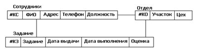 Рисунок 6.4 – Таблицы данных во 2НФ После представления таблиц во 2НФ, представим шапки таблиц в 3НФ: Сотрудники