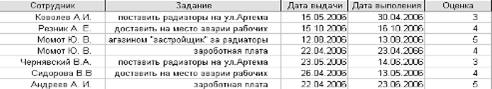 Таблица «О заданиях» (таблица 6.2.5): 1. Сотрудник -Тип длинное целое[2]; -Обязательное поле, так как каждый задание должно выполняться сотрудником; -Совпадения допускаются, так как несколько сотрудников могут выполнять одно задание; -Подстановка: из таблицы «Сотрудники», поле «#КС»; -Внешний ключ. 2. Задание -Тип длинное целое[2]; -Обязательное поле, так как каждый сотрудник должен выполнять задание; -Совпадения допускаются, так как несколько сотрудников могут выполнять одно задание; -Подстановка: из таблицы «Задания», поле «#КЗ»; -Внешний ключ. 3. Дата выдачи -Тип дата[10]; - Обязательное поле, так как задание должно иметь дату выдачи; -Совпадения допускаются, так как разные задания могут выдаваться в один день; - Маска: 00.00.0000; -Значение по умолчанию =Date(); - Условие на значения =Date() так как задание должно иметь текущую дату выдачи. 4. Дата выполнения -Тип дата[10]; - Не обязательное поле, так как задание может выдаваться без срока выполнения; -Совпадения допускаются, так как различные задания могут иметь один срок выполнения; - Маска: 00.00.0000; - Значение по умолчанию =Date() - Условие на значения >=Date()and>(дата выдачи), так как задание не может быть выполнено раньше, чем выдано. 5. Оценка -Тип длинное целое[1]; -Поле не обязательное, так как задание может быть не выполнено на текущий момент; -Совпадения допускаются, так как задания могут выполняться на одну оценку; -Подстановка: используется фиксированный набор значений; Таблица 6.2.5 «О заданиях» |