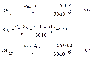 где υм - скорость течения масла на рассматриваемом участке гидросистемы при обеспечении рабочей подачи выходного звена привода, d - номинальный внутренний диаметр трубопровода рассматриваемого участка гидросистемы; ν - кинематическая вязкость жидкости.